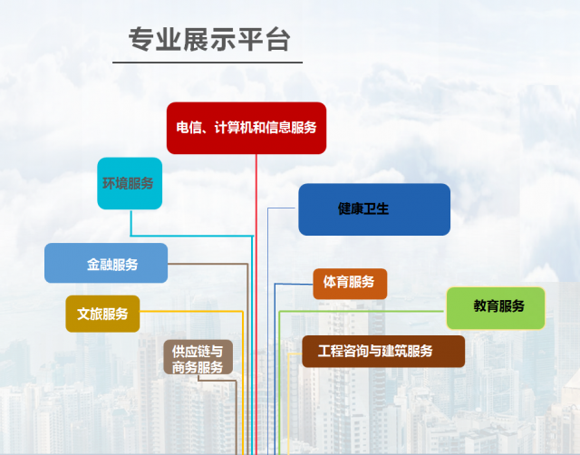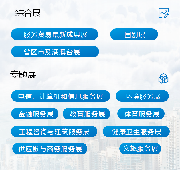 其中,綜合展年度主題專區包括阿里巴巴(中國)有限公司等55家;電信、計算機和信息服務專題包括聯想集團等11家;金融服務專題包括北京產權交易所等54家;文旅服務專題包括北京北控置業集團有限公司等23家;教育服務專題包括北京法語聯盟等36家;體育服務專題包括阿科瑟司(北京)科技有限公司(AXESS)等47家;供應鏈與商務服務專題包括首農食品集團等11家;工程咨詢與建筑服務專題包括北京首都開發控股(集團)有限公司等27家;健康衛生服務專題包括北京大學第三醫院等53家;環境服務專題包括國家電網等37家。